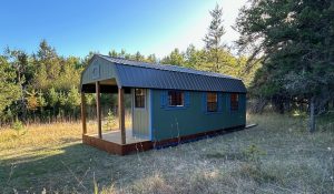 The Utility Center Porch option features 8′ walls. Minimum building size is 12′ x 24′. Image shown includes additional options that may not be part of the standard package. This package is not available with Vertical Metal siding.