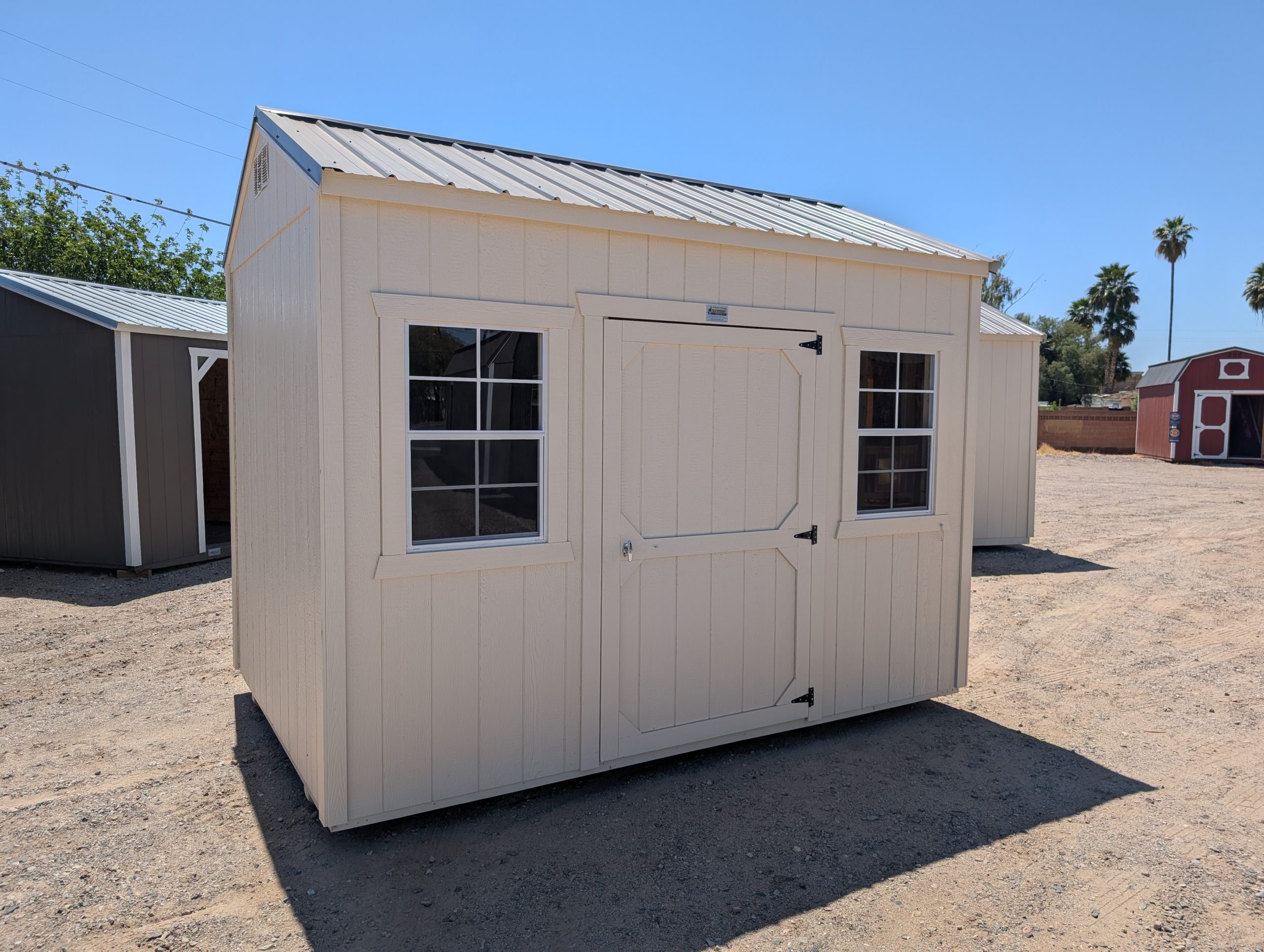 We proudly sell Old Hickory Buildings & Sheds! Our sales lot in Buckeye, AZ offers a wide variety of portable buildings and sheds for sale, including Storage Barns, Lofted Barns, Utility Sheds, Portable Buildings, Mini Barns, Garages, Animal Shelters, Playhouses, Cabins, Single Slope Sheds, Sheds with Porches, Sheds with Dormers, and more. We can sell and deliver sheds directly from our location, or if you don’t find the exact portable building or shed you want…we can work with you to create a custom building using the Old Hickory 3D Builder!