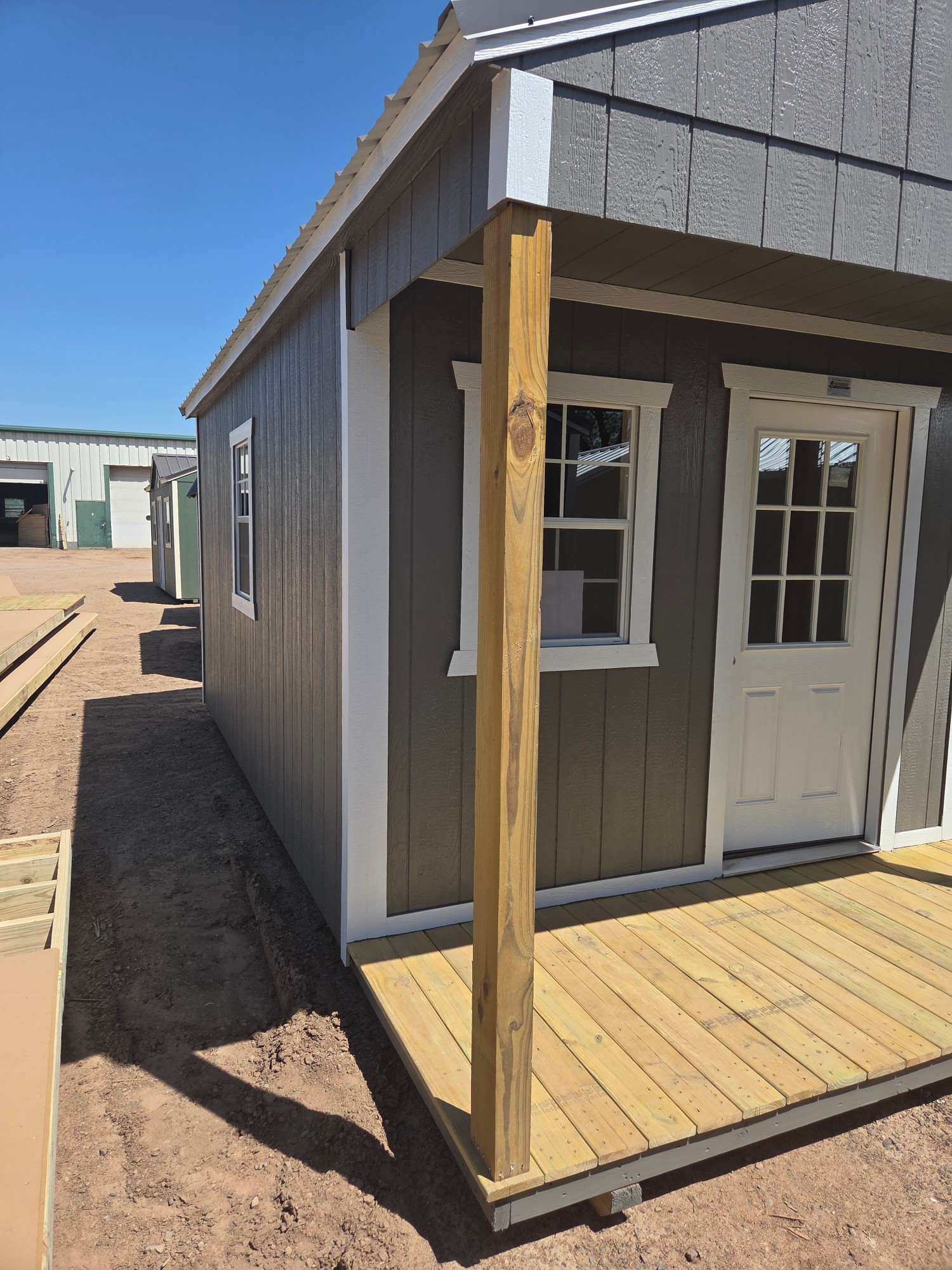 The Playhouse package is an easy add-on if you’re looking to give your barn or shed some country style and a place to sit in the shade. It includes a 9-lite walk-in door, 4ft of porch, two porch posts, and three 2x3ft single-pane windows. The Utility version includes 8ft walls.As an upgrade to the Utility Shed with Playhouse Package, the Vaulted Gable utilizes painted wood posts, beams and a crow’s foot architectural detail to create a full height open front porch.