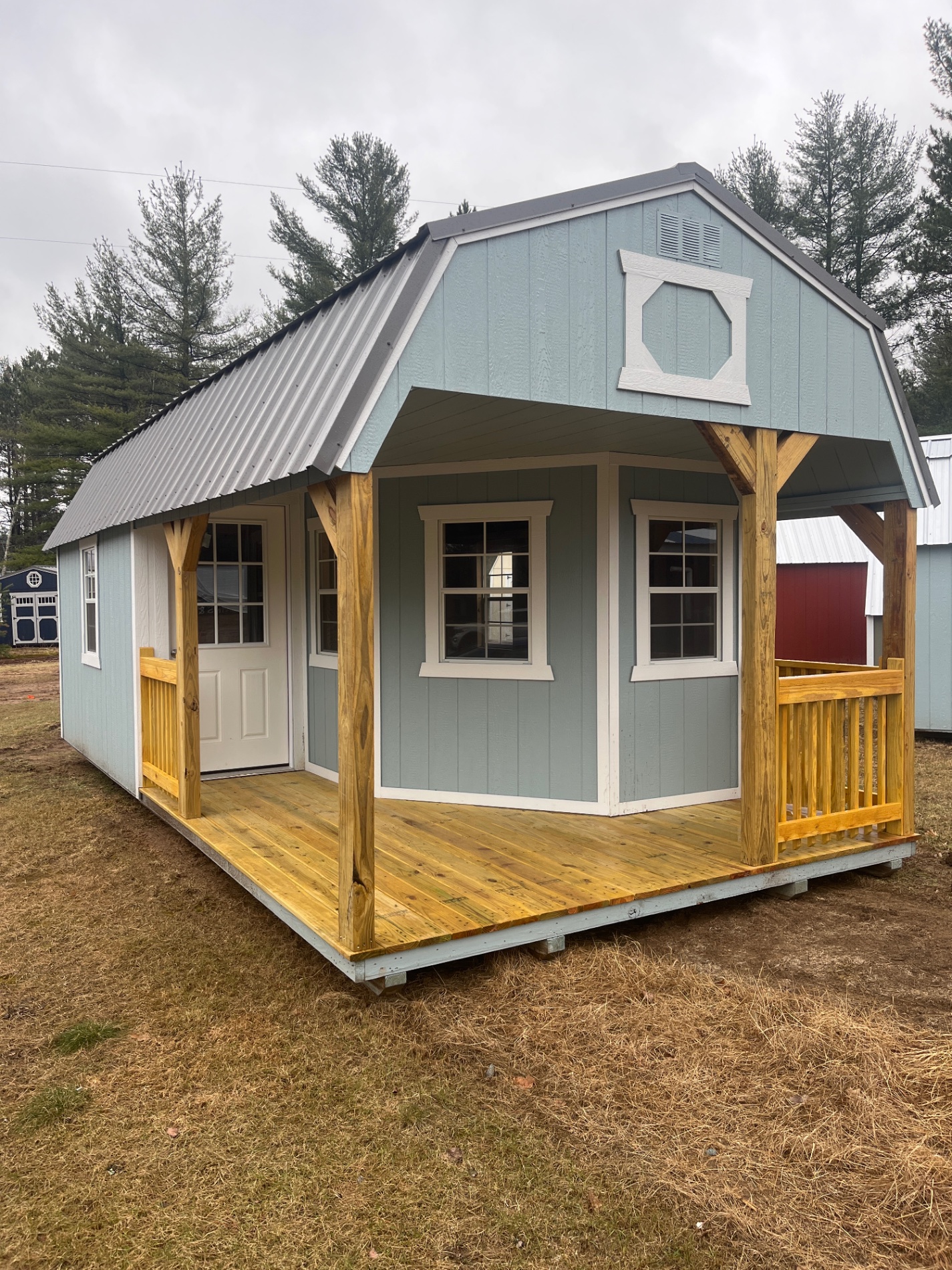 The Playhouse package is an easy add-on if you’re looking to give your barn or shed some country style and a place to sit in the shade. It includes a 9-lite walk-in door, 4ft of porch, two porch posts, and three 2x3ft single-pane windows. The Utility version includes 8ft walls.As an upgrade to the Utility Shed with Playhouse Package, the Vaulted Gable utilizes painted wood posts, beams and a crow’s foot architectural detail to create a full height open front porch.
