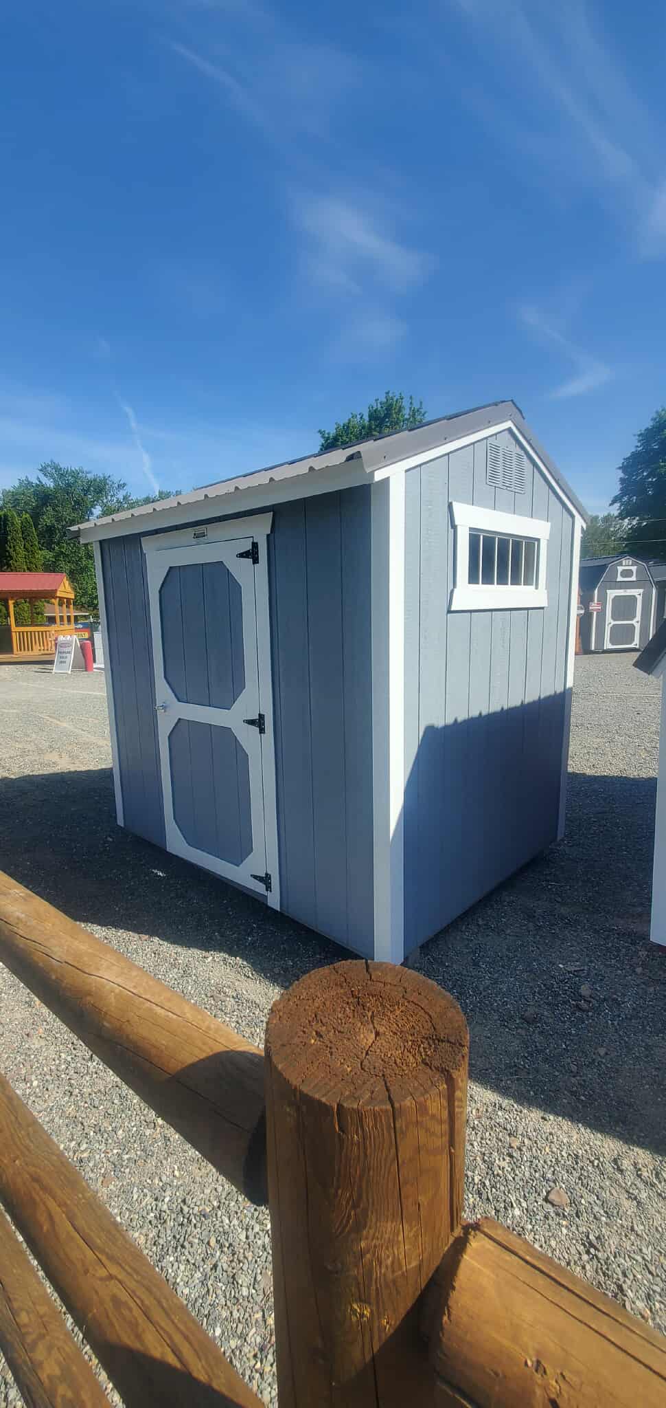 The Playhouse package is an easy add-on if you’re looking to give your barn or shed some country style and a place to sit in the shade. It includes a 9-lite walk-in door, 4ft of porch, two porch posts, and three 2x3ft single-pane windows. The Utility version includes 8ft walls.As an upgrade to the Utility Shed with Playhouse Package, the Vaulted Gable utilizes painted wood posts, beams and a crow’s foot architectural detail to create a full height open front porch.
