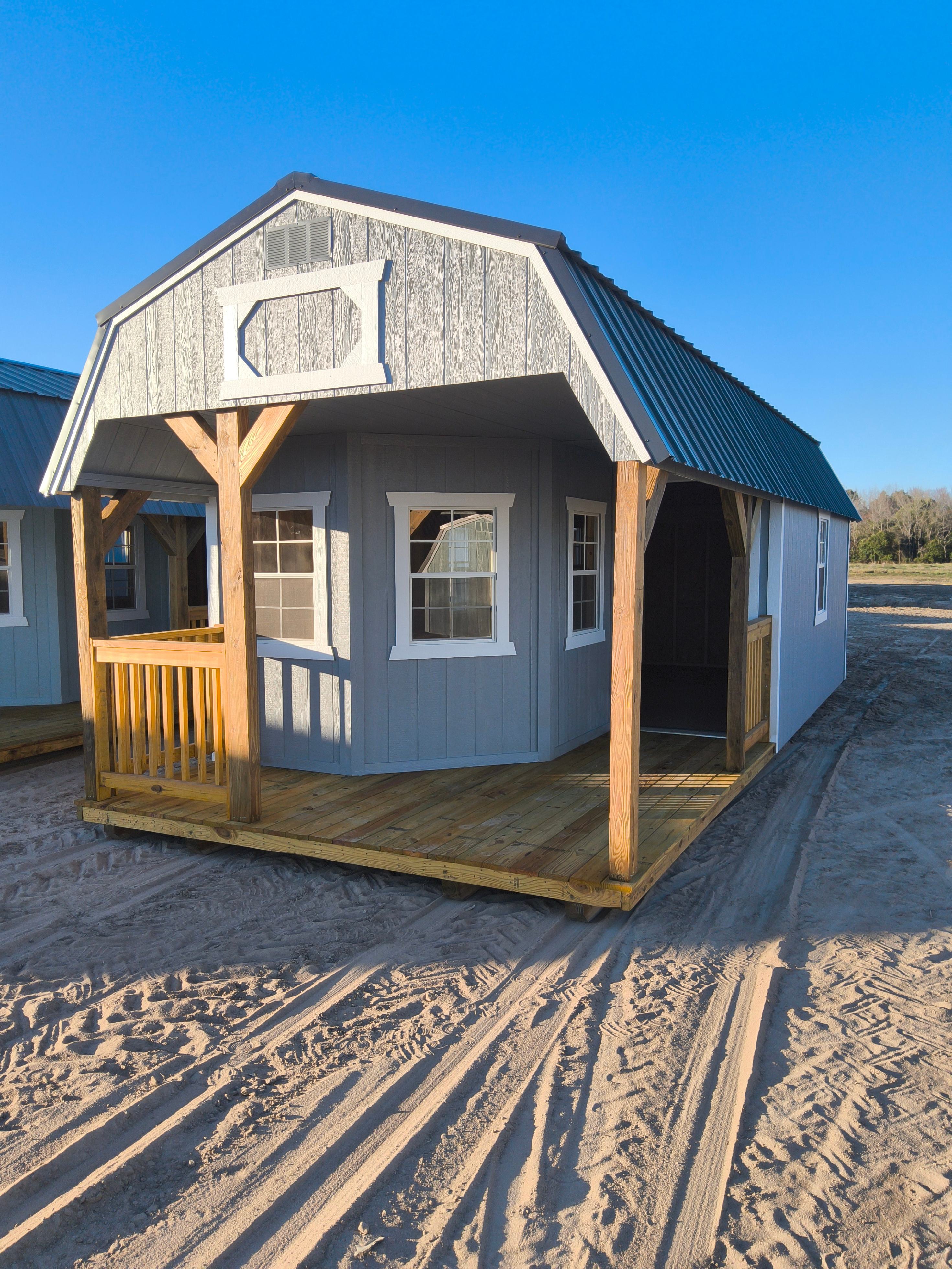 The Playhouse package is an easy add-on if you’re looking to give your barn or shed some country style and a place to sit in the shade. It includes a 9-lite walk-in door, 4ft of porch, two porch posts, and three 2x3ft single-pane windows. The Utility version includes 8ft walls.As an upgrade to the Utility Shed with Playhouse Package, the Vaulted Gable utilizes painted wood posts, beams and a crow’s foot architectural detail to create a full height open front porch.