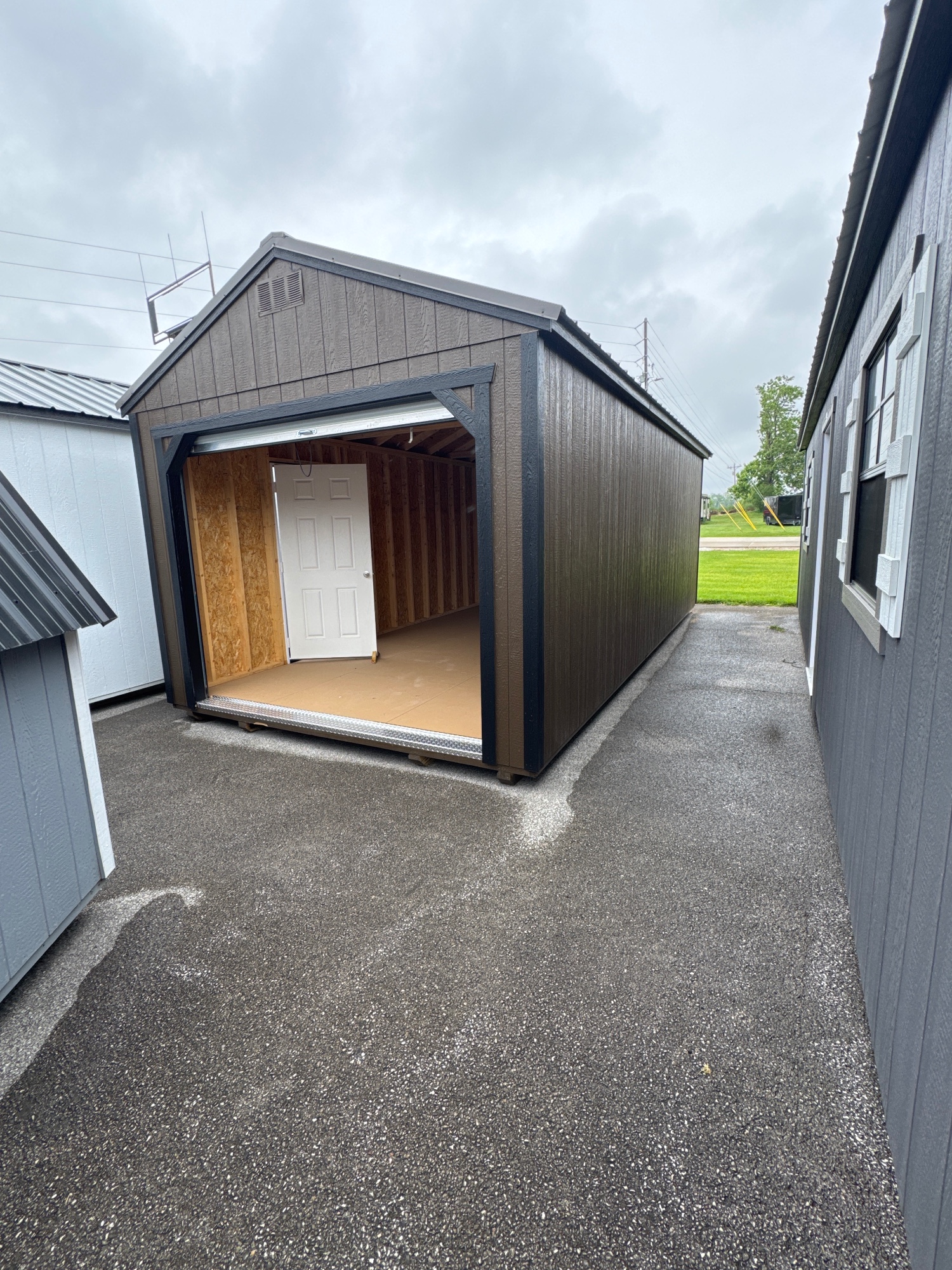 A rollup garage door is ideal for easy-access storage, especially for larger items that need a wide lockable opening. The package also includes a solid walk-in door, one 2x3ft single-pane window, 12in On-Center floor joists, and a diamond plate door threshold. The Utility version includes 8ft walls.