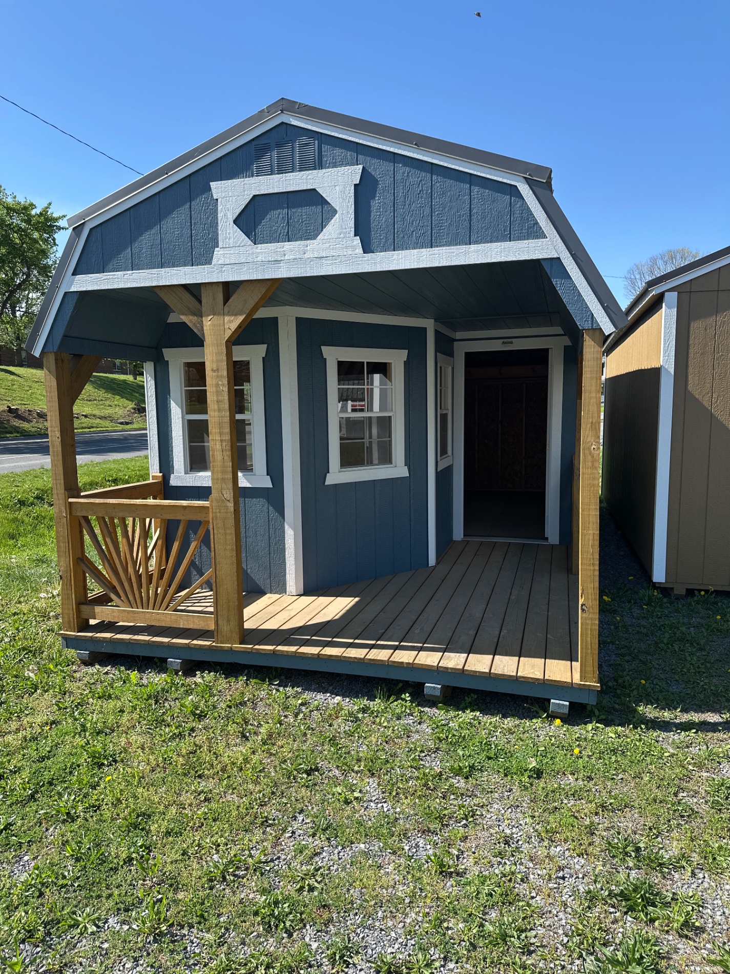 The Playhouse package is an easy add-on if you’re looking to give your barn or shed some country style and a place to sit in the shade. It includes a 9-lite walk-in door, 4ft of porch, two porch posts, and three 2x3ft single-pane windows. The Utility version includes 8ft walls.As an upgrade to the Utility Shed with Playhouse Package, the Vaulted Gable utilizes painted wood posts, beams and a crow’s foot architectural detail to create a full height open front porch.