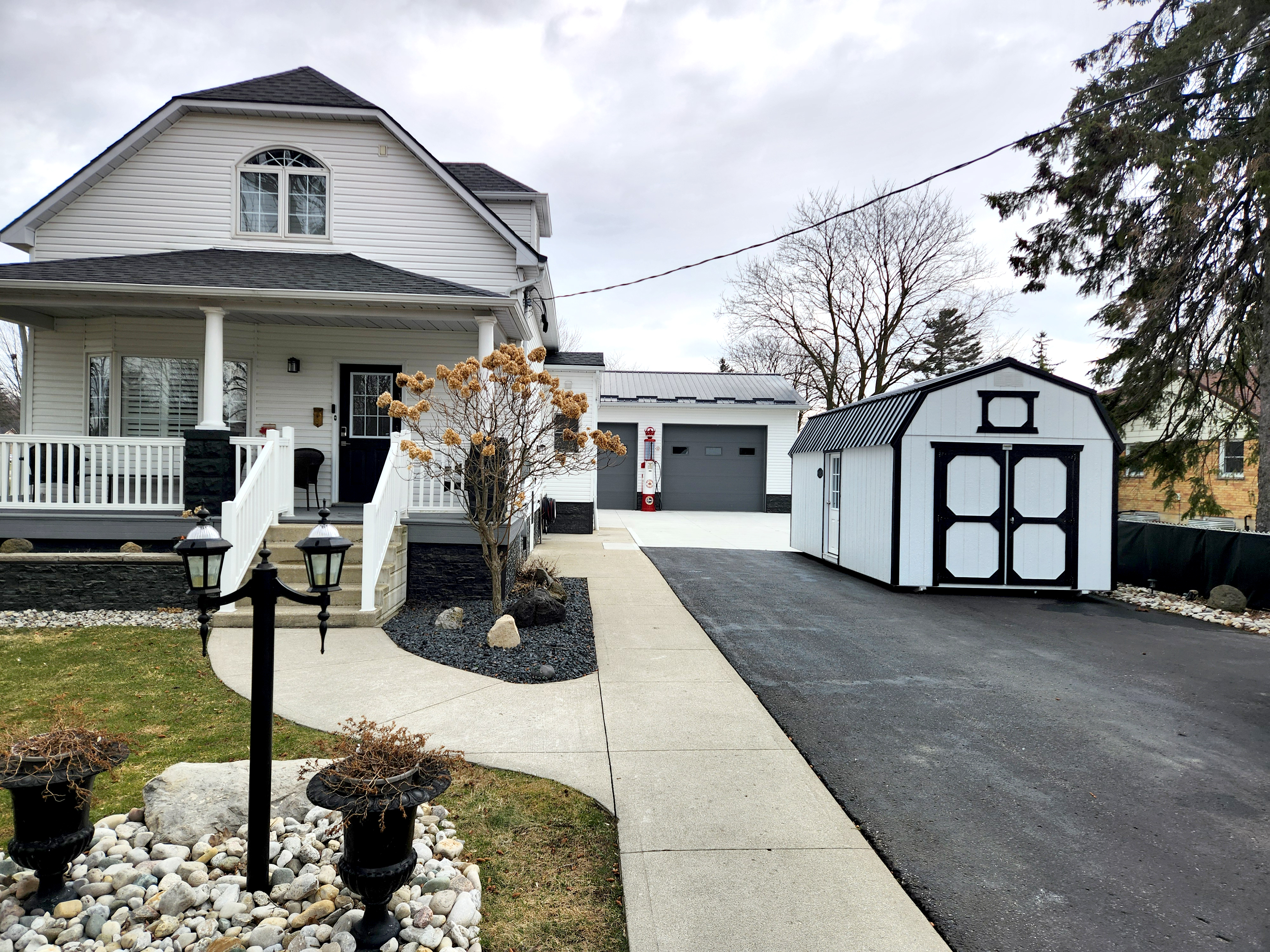 The Playhouse package is an easy add-on if you’re looking to give your barn or shed some country style and a place to sit in the shade. It includes a 9-lite walk-in door, 4ft of porch, two porch posts, and three 2x3ft single-pane windows. The Utility version includes 8ft walls. As an upgrade to the Utility Shed with Playhouse Package, the Vaulted Gable utilizes painted wood posts, beams and a crow’s foot architectural detail to create a full height open front porch.
