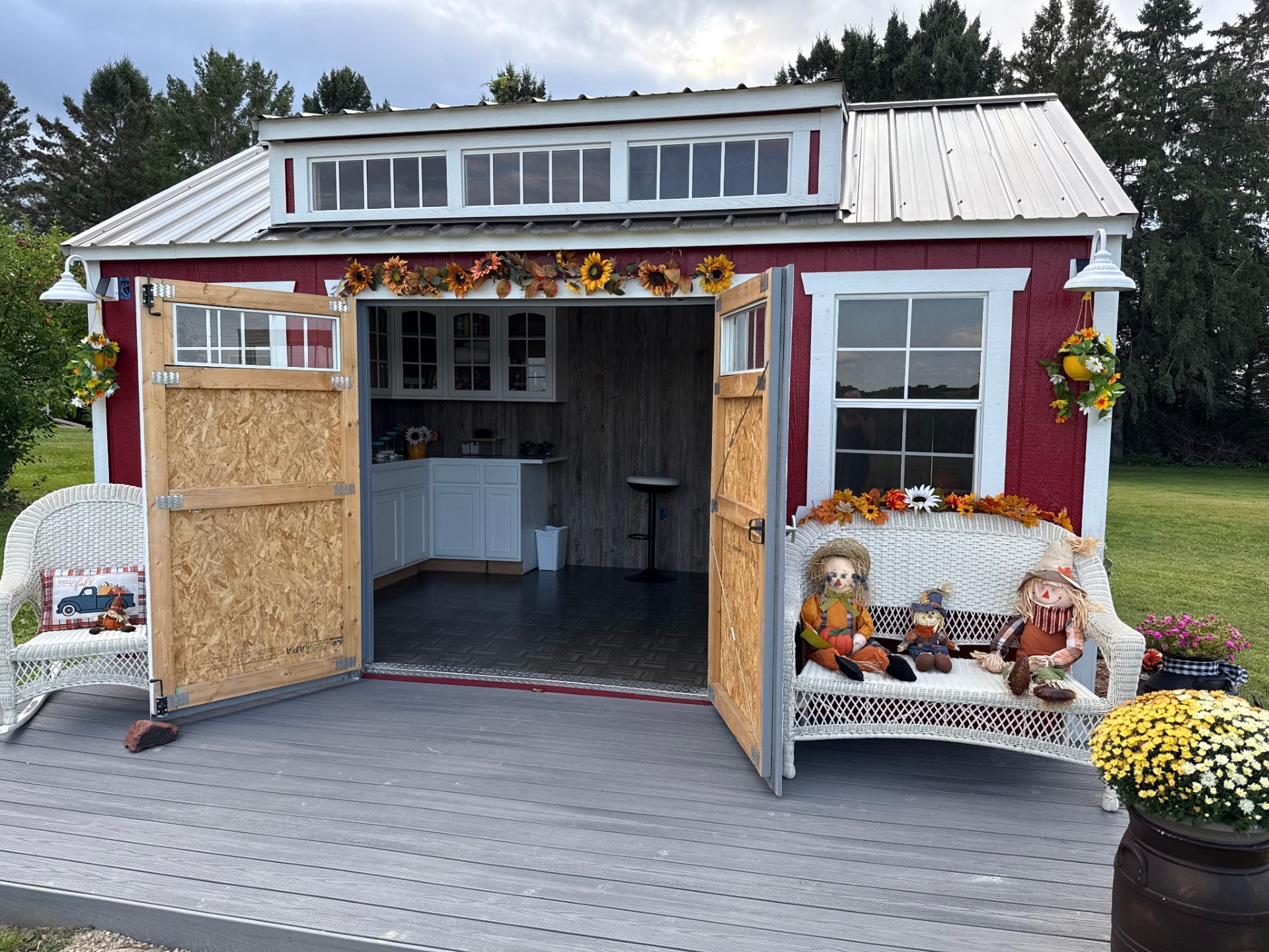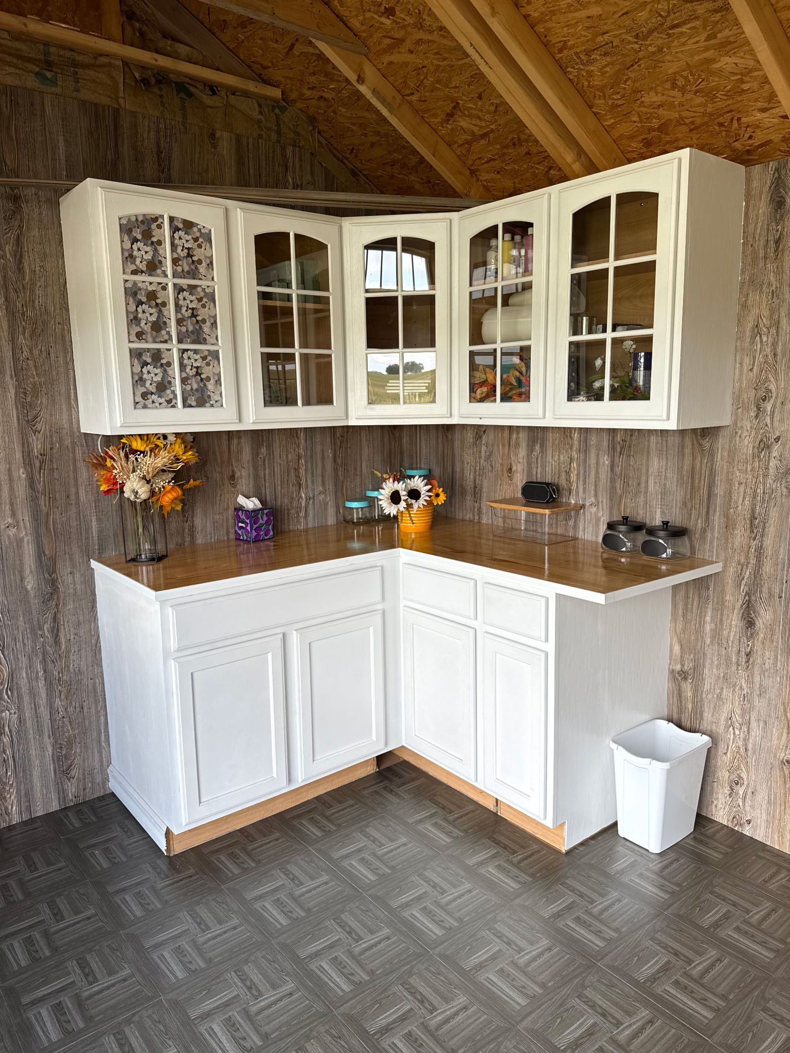 The Playhouse package is an easy add-on if you’re looking to give your barn or shed some country style and a place to sit in the shade. It includes a 9-lite walk-in door, 4ft of porch, two porch posts, and three 2x3ft single-pane windows. The Utility version includes 8ft walls. As an upgrade to the Utility Shed with Playhouse Package, the Vaulted Gable utilizes painted wood posts, beams and a crow’s foot architectural detail to create a full height open front porch.